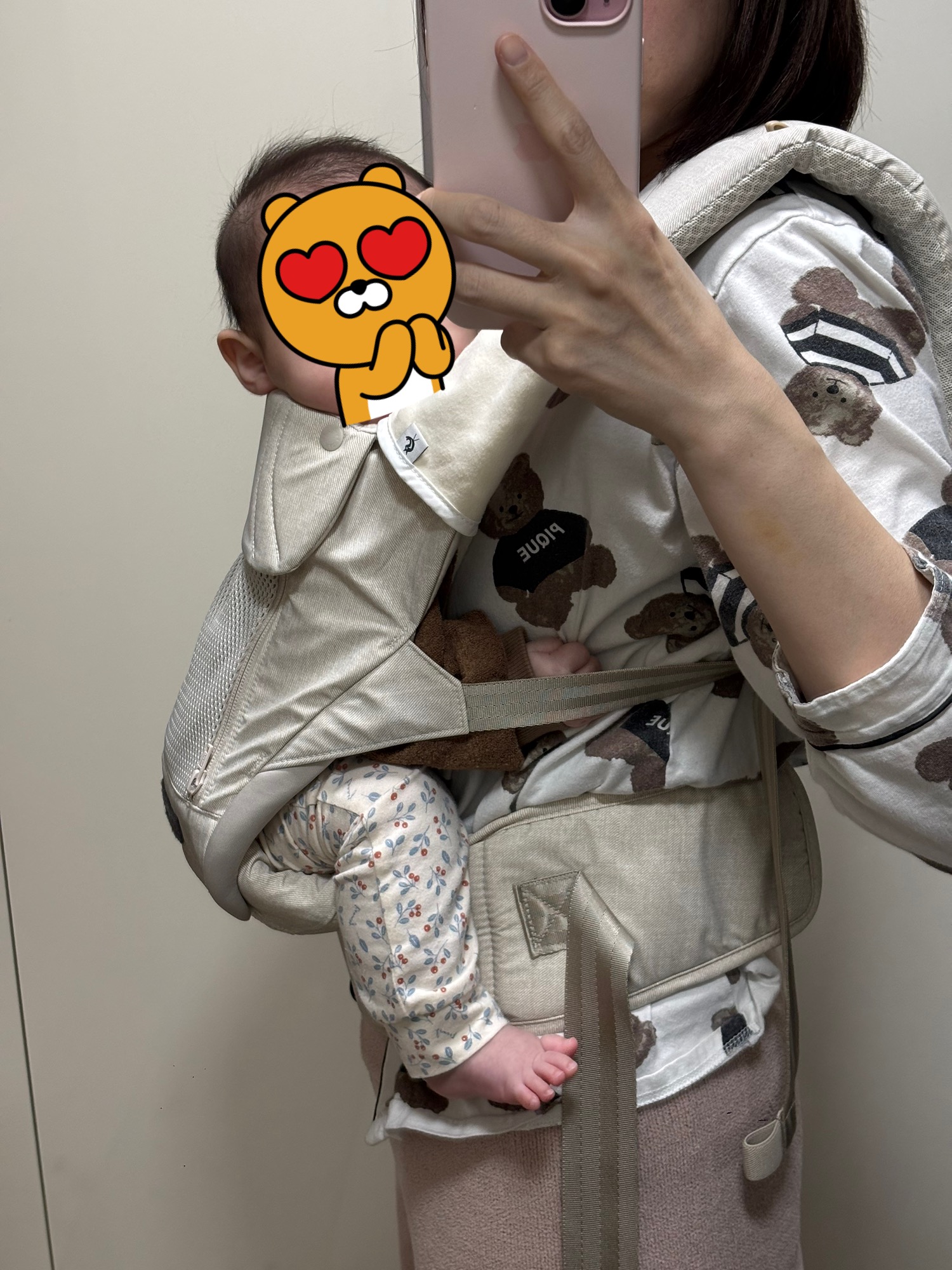 - 아기띠 자체는 신생아때부턴 가능하다고는 하나, 목 가눈 이후부터 이용 가능할듯